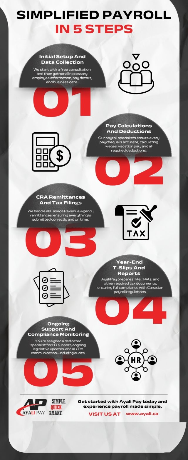 At Ayali Pay, we understand how managing Canadian payroll documents can be complex and time-consuming. Our all-inclusive payroll services in Toronto provide accurate, timely handling of all your payroll documentation needs. Whether you require CRA payroll audit support or payroll for small businesses in Toronto, our team ensures compliance and support.